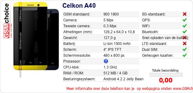 Gegevens van de telefoon Celkon A40 op jouw webpagina