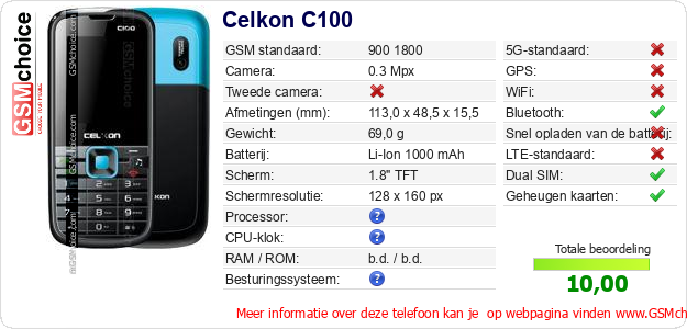 Verkoop je op ebay.com? Heb je jouw eigen webpagina? Als je de basisgegevens over Celkon C100 ergens wilt publiceren, dan is het heel simpel. Het is voldoende om deze code te kopiëren en op jouw webpagina te plakken:Als je deze code plakt, dan wordt de onderstaande afbeelding getoond: