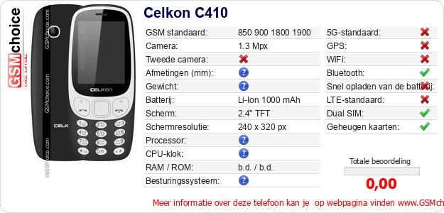 Gegevens van de telefoon Celkon C410 op jouw webpagina