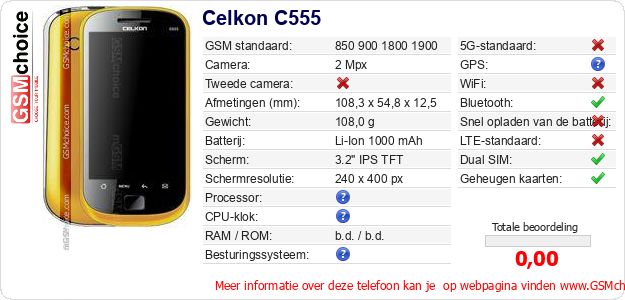 Gegevens van de telefoon Celkon C555 op jouw webpagina