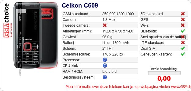 Gegevens van de telefoon Celkon C609 op jouw webpagina