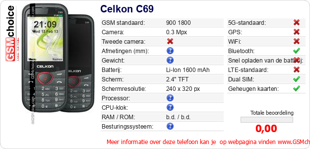Gegevens van de telefoon Celkon C69 op jouw webpagina