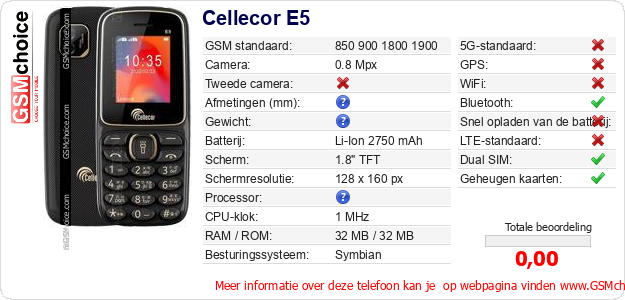 Gegevens van de telefoon Cellecor E5 op jouw webpagina