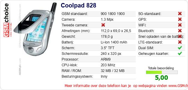 Verkoop je op ebay.com? Heb je jouw eigen webpagina? Als je de basisgegevens over Coolpad 828 ergens wilt publiceren, dan is het heel simpel. Het is voldoende om deze code te kopiëren en op jouw webpagina te plakken:Als je deze code plakt, dan wordt de onderstaande afbeelding getoond:
