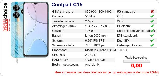 Verkoop je op ebay.com? Heb je jouw eigen webpagina? Als je de basisgegevens over Coolpad C15 ergens wilt publiceren, dan is het heel simpel. Het is voldoende om deze code te kopiëren en op jouw webpagina te plakken:Als je deze code plakt, dan wordt de onderstaande afbeelding getoond: