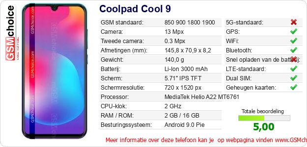 Gegevens van de telefoon Coolpad Cool 9 op jouw webpagina