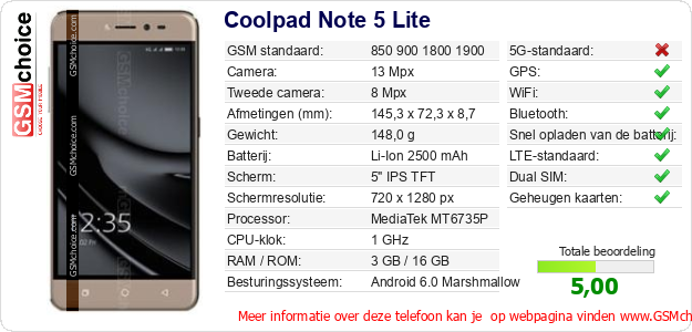Gegevens van de telefoon Coolpad Note 5 Lite op jouw webpagina