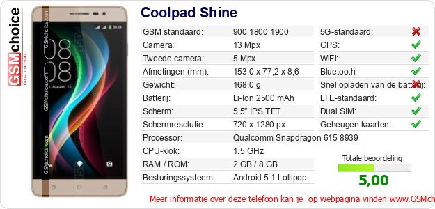 Gegevens van de telefoon Coolpad Shine op jouw webpagina