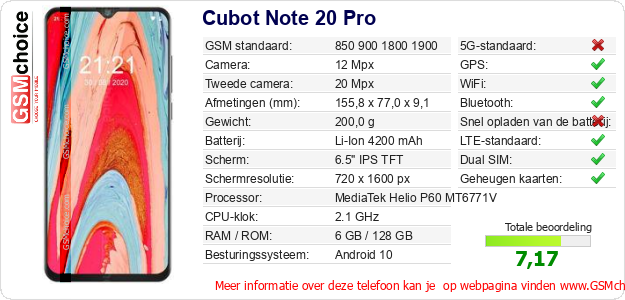 Verkoop je op ebay.com? Heb je jouw eigen webpagina? Als je de basisgegevens over Cubot Note 20 Pro ergens wilt publiceren, dan is het heel simpel. Het is voldoende om deze code te kopiëren en op jouw webpagina te plakken:Als je deze code plakt, dan wordt de onderstaande afbeelding getoond:
