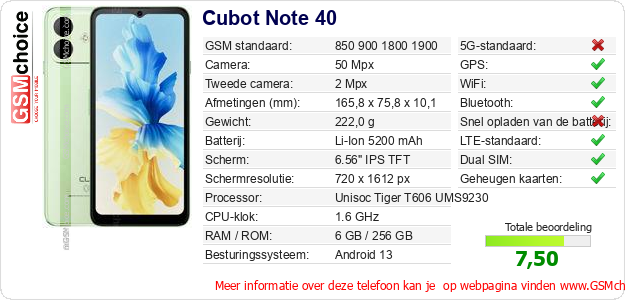 Gegevens van de telefoon Cubot Note 40 op jouw webpagina