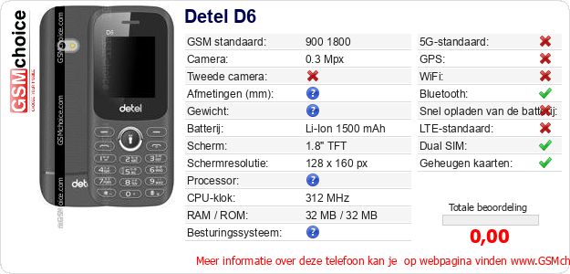 Gegevens van de telefoon Detel D6 op jouw webpagina