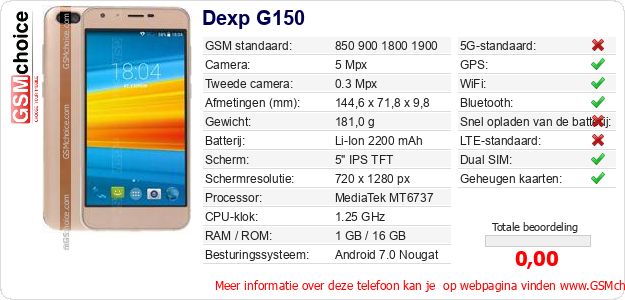 Gegevens van de telefoon Dexp G150 op jouw webpagina