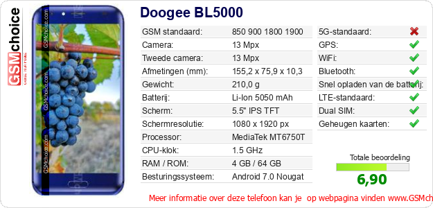 Verkoop je op ebay.com? Heb je jouw eigen webpagina? Als je de basisgegevens over Doogee BL5000 ergens wilt publiceren, dan is het heel simpel. Het is voldoende om deze code te kopiëren en op jouw webpagina te plakken:Als je deze code plakt, dan wordt de onderstaande afbeelding getoond: