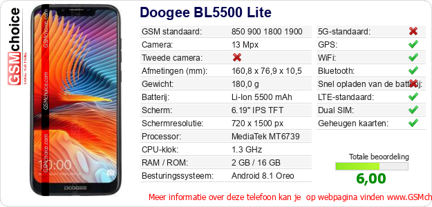 Gegevens van de telefoon Doogee BL5500 Lite op jouw webpagina