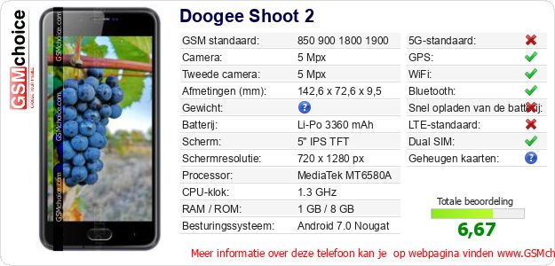 Verkoop je op ebay.com? Heb je jouw eigen webpagina? Als je de basisgegevens over Doogee Shoot 2 ergens wilt publiceren, dan is het heel simpel. Het is voldoende om deze code te kopiëren en op jouw webpagina te plakken:Als je deze code plakt, dan wordt de onderstaande afbeelding getoond:
