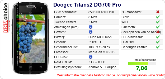 Verkoop je op ebay.com? Heb je jouw eigen webpagina? Als je de basisgegevens over Doogee Titans2 DG700 Pro ergens wilt publiceren, dan is het heel simpel. Het is voldoende om deze code te kopiëren en op jouw webpagina te plakken:Als je deze code plakt, dan wordt de onderstaande afbeelding getoond: