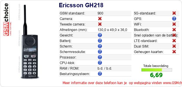 Verkoop je op ebay.com? Heb je jouw eigen webpagina? Als je de basisgegevens over Ericsson GH218 ergens wilt publiceren, dan is het heel simpel. Het is voldoende om deze code te kopiëren en op jouw webpagina te plakken:Als je deze code plakt, dan wordt de onderstaande afbeelding getoond: