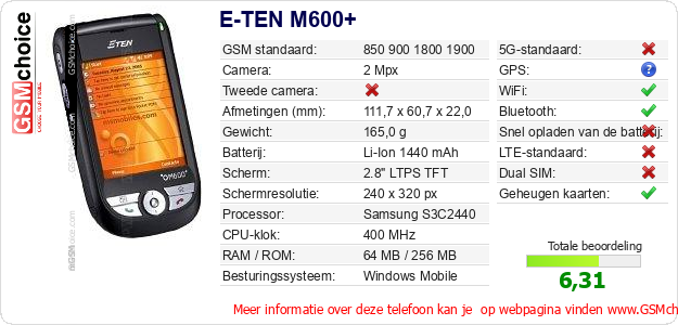 Gegevens van de telefoon E-TEN M600+ op jouw webpagina