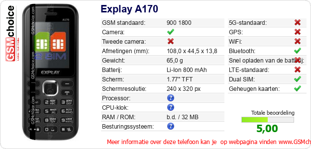 Gegevens van de telefoon Explay A170 op jouw webpagina