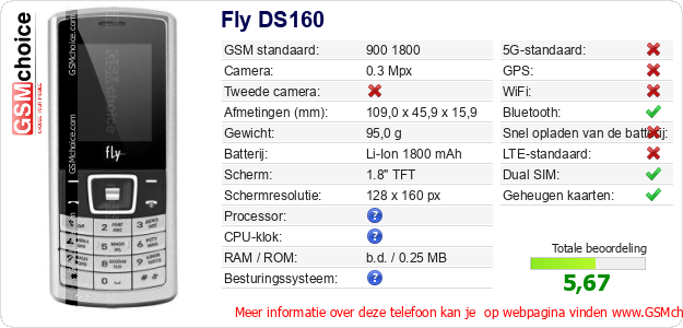 Gegevens van de telefoon Fly DS160 op jouw webpagina