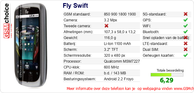 Gegevens van de telefoon Fly Swift op jouw webpagina