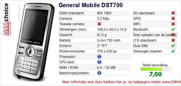 Verkoop je op ebay.com? Heb je jouw eigen webpagina? Als je de basisgegevens over General Mobile DST700 ergens wilt publiceren, dan is het heel simpel. Het is voldoende om deze code te kopiëren en op jouw webpagina te plakken:Als je deze code plakt, dan wordt de onderstaande afbeelding getoond:
