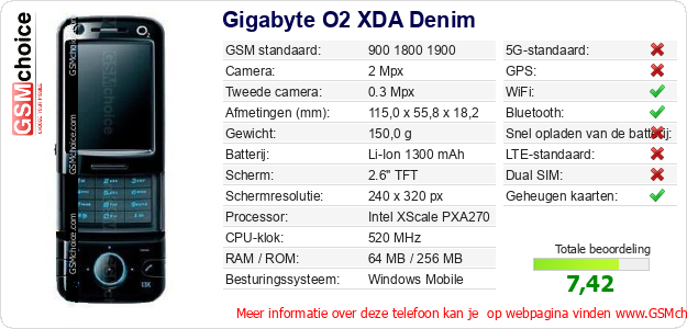 Gegevens van de telefoon Gigabyte O2 XDA Denim op jouw webpagina