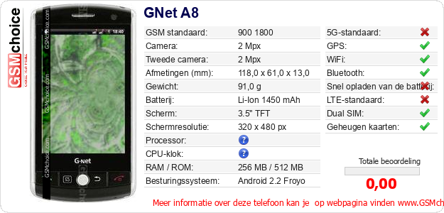 Gegevens van de telefoon GNet A8 op jouw webpagina