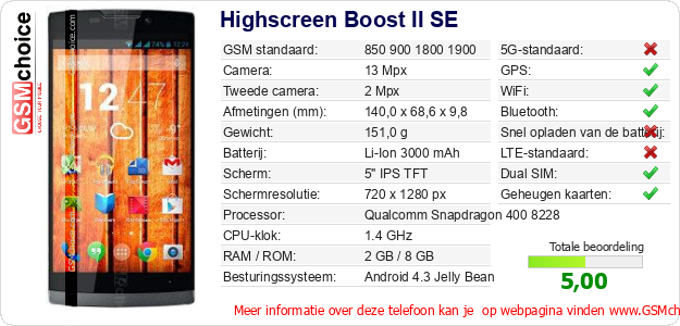 Gegevens van de telefoon Highscreen Boost II SE op jouw webpagina
