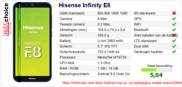 Gegevens van de telefoon Hisense Infinity E8 op jouw webpagina