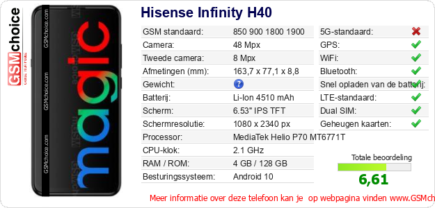 Verkoop je op ebay.com? Heb je jouw eigen webpagina? Als je de basisgegevens over Hisense Infinity H40 ergens wilt publiceren, dan is het heel simpel. Het is voldoende om deze code te kopiëren en op jouw webpagina te plakken:Als je deze code plakt, dan wordt de onderstaande afbeelding getoond: