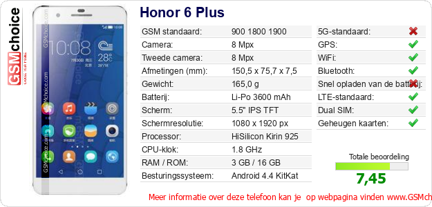 Gegevens van de telefoon Honor 6 Plus op jouw webpagina