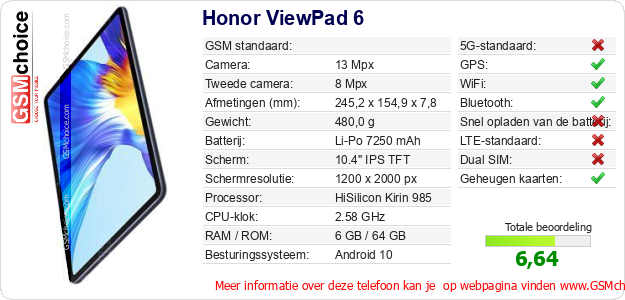 Verkoop je op ebay.com? Heb je jouw eigen webpagina? Als je de basisgegevens over Honor ViewPad 6 ergens wilt publiceren, dan is het heel simpel. Het is voldoende om deze code te kopiëren en op jouw webpagina te plakken:Als je deze code plakt, dan wordt de onderstaande afbeelding getoond: