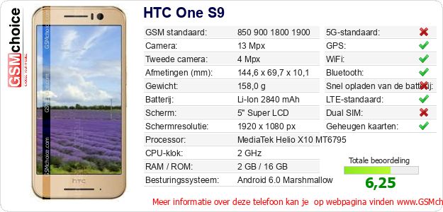 Gegevens van de telefoon HTC One S9 op jouw webpagina