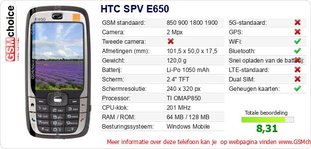 Gegevens van de telefoon HTC SPV E650 op jouw webpagina