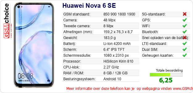 Gegevens van de telefoon Huawei Nova 6 SE op jouw webpagina