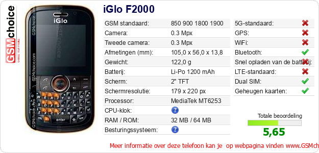 Gegevens van de telefoon iGlo F2000 op jouw webpagina