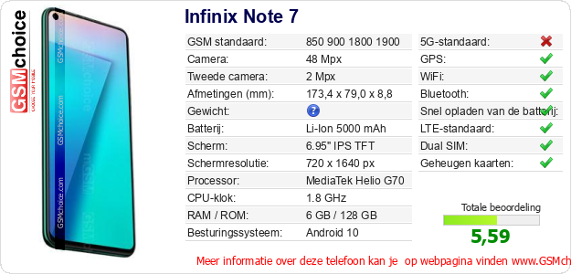 Verkoop je op ebay.com? Heb je jouw eigen webpagina? Als je de basisgegevens over Infinix Note 7 ergens wilt publiceren, dan is het heel simpel. Het is voldoende om deze code te kopiëren en op jouw webpagina te plakken:Als je deze code plakt, dan wordt de onderstaande afbeelding getoond: