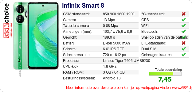 Verkoop je op ebay.com? Heb je jouw eigen webpagina? Als je de basisgegevens over Infinix Smart 8 ergens wilt publiceren, dan is het heel simpel. Het is voldoende om deze code te kopiëren en op jouw webpagina te plakken:Als je deze code plakt, dan wordt de onderstaande afbeelding getoond: