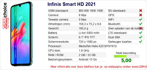 Verkoop je op ebay.com? Heb je jouw eigen webpagina? Als je de basisgegevens over Infinix Smart HD 2021 ergens wilt publiceren, dan is het heel simpel. Het is voldoende om deze code te kopiëren en op jouw webpagina te plakken:Als je deze code plakt, dan wordt de onderstaande afbeelding getoond: