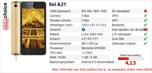 Verkoop je op ebay.com? Heb je jouw eigen webpagina? Als je de basisgegevens over Itel A21 ergens wilt publiceren, dan is het heel simpel. Het is voldoende om deze code te kopiëren en op jouw webpagina te plakken:Als je deze code plakt, dan wordt de onderstaande afbeelding getoond: