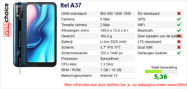 Gegevens van de telefoon Itel A37 op jouw webpagina
