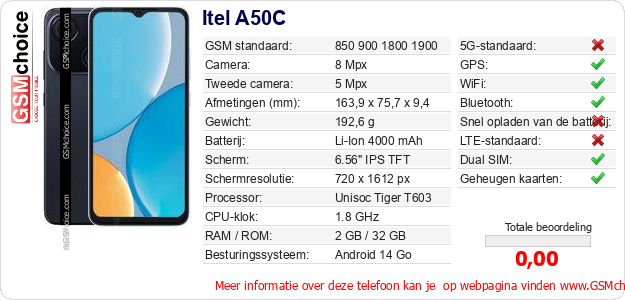 Verkoop je op ebay.com? Heb je jouw eigen webpagina? Als je de basisgegevens over Itel A50C ergens wilt publiceren, dan is het heel simpel. Het is voldoende om deze code te kopiëren en op jouw webpagina te plakken:Als je deze code plakt, dan wordt de onderstaande afbeelding getoond: