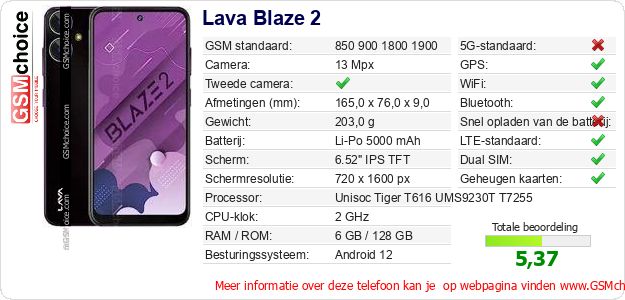 Verkoop je op ebay.com? Heb je jouw eigen webpagina? Als je de basisgegevens over Lava Blaze 2 ergens wilt publiceren, dan is het heel simpel. Het is voldoende om deze code te kopiëren en op jouw webpagina te plakken:Als je deze code plakt, dan wordt de onderstaande afbeelding getoond: