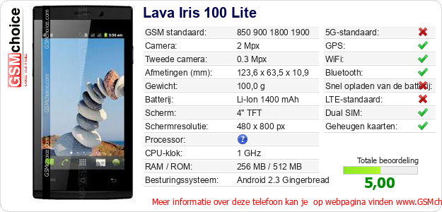 Verkoop je op ebay.com? Heb je jouw eigen webpagina? Als je de basisgegevens over Lava Iris 100 Lite ergens wilt publiceren, dan is het heel simpel. Het is voldoende om deze code te kopiëren en op jouw webpagina te plakken:Als je deze code plakt, dan wordt de onderstaande afbeelding getoond: