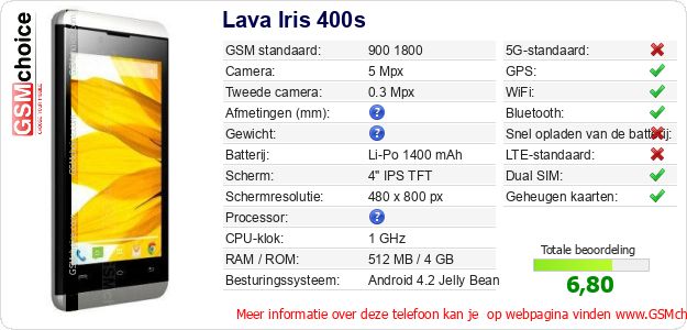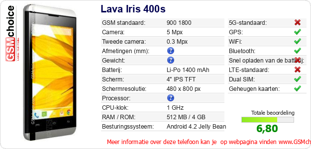Gegevens van de telefoon Lava Iris 400s op jouw webpagina