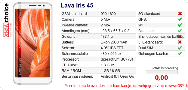 Gegevens van de telefoon Lava Iris 45 op jouw webpagina