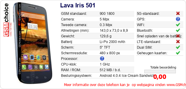 Gegevens van de telefoon Lava Iris 501 op jouw webpagina