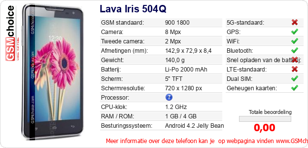 Gegevens van de telefoon Lava Iris 504Q op jouw webpagina