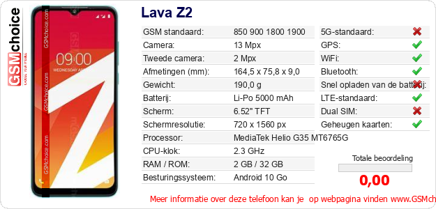 Gegevens van de telefoon Lava Z2 op jouw webpagina